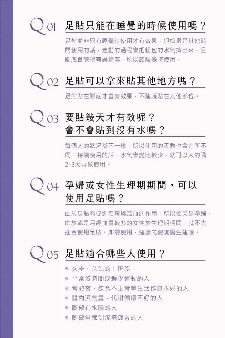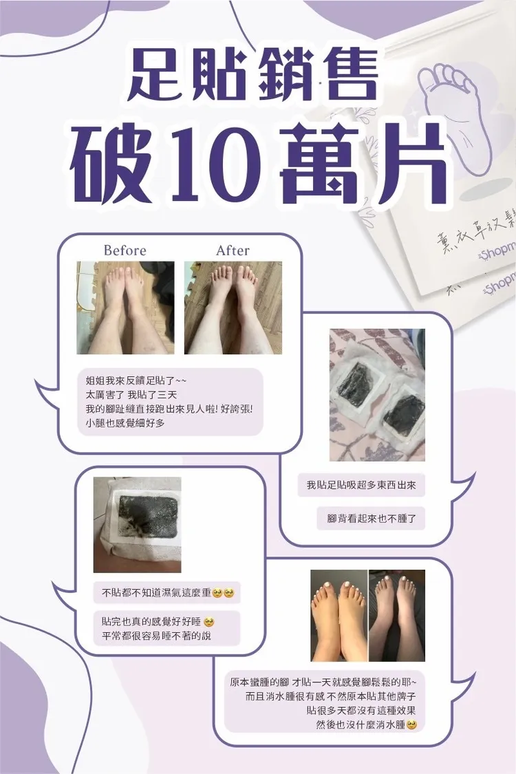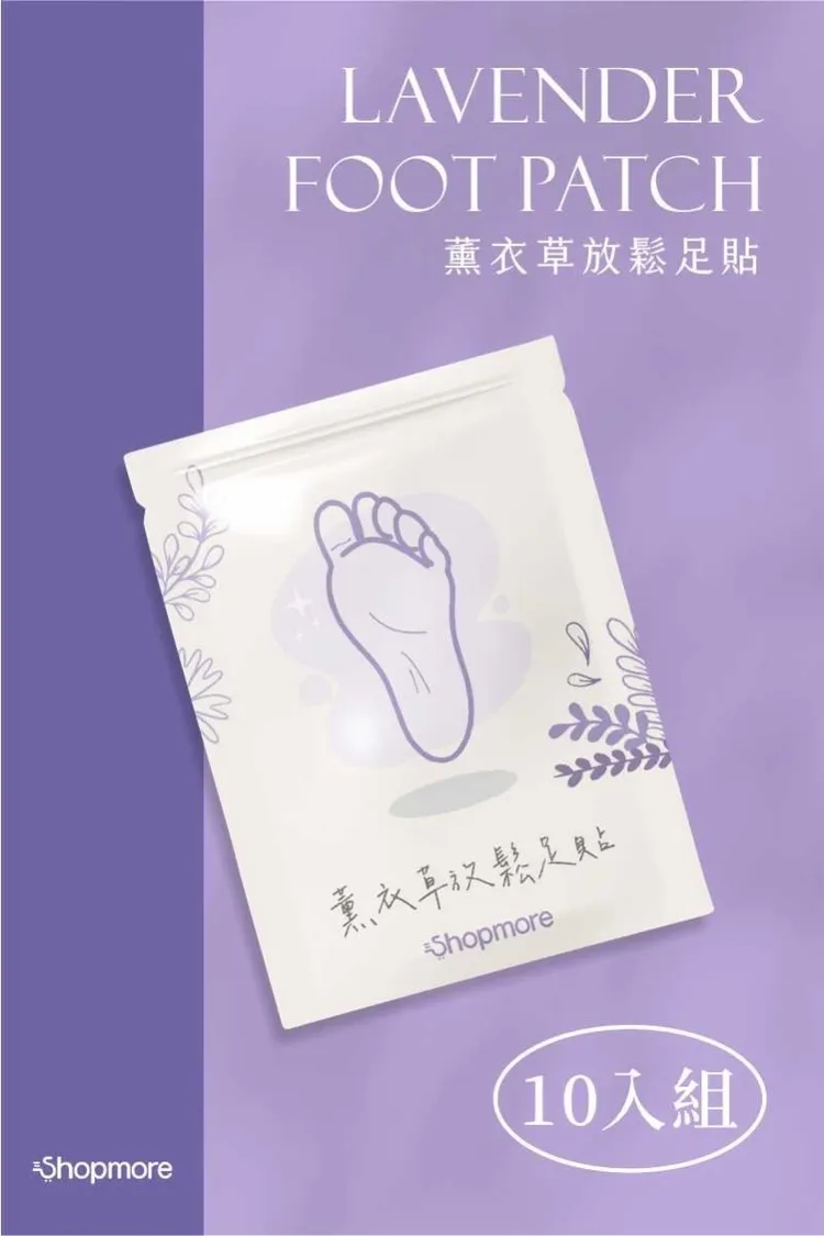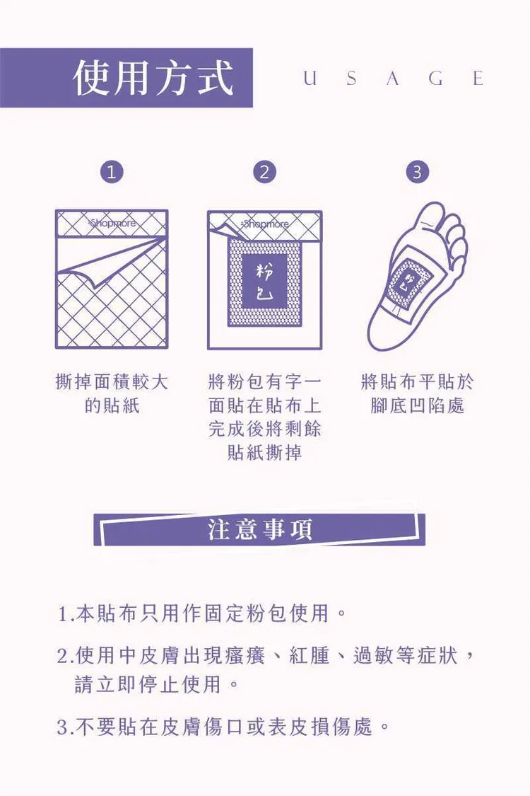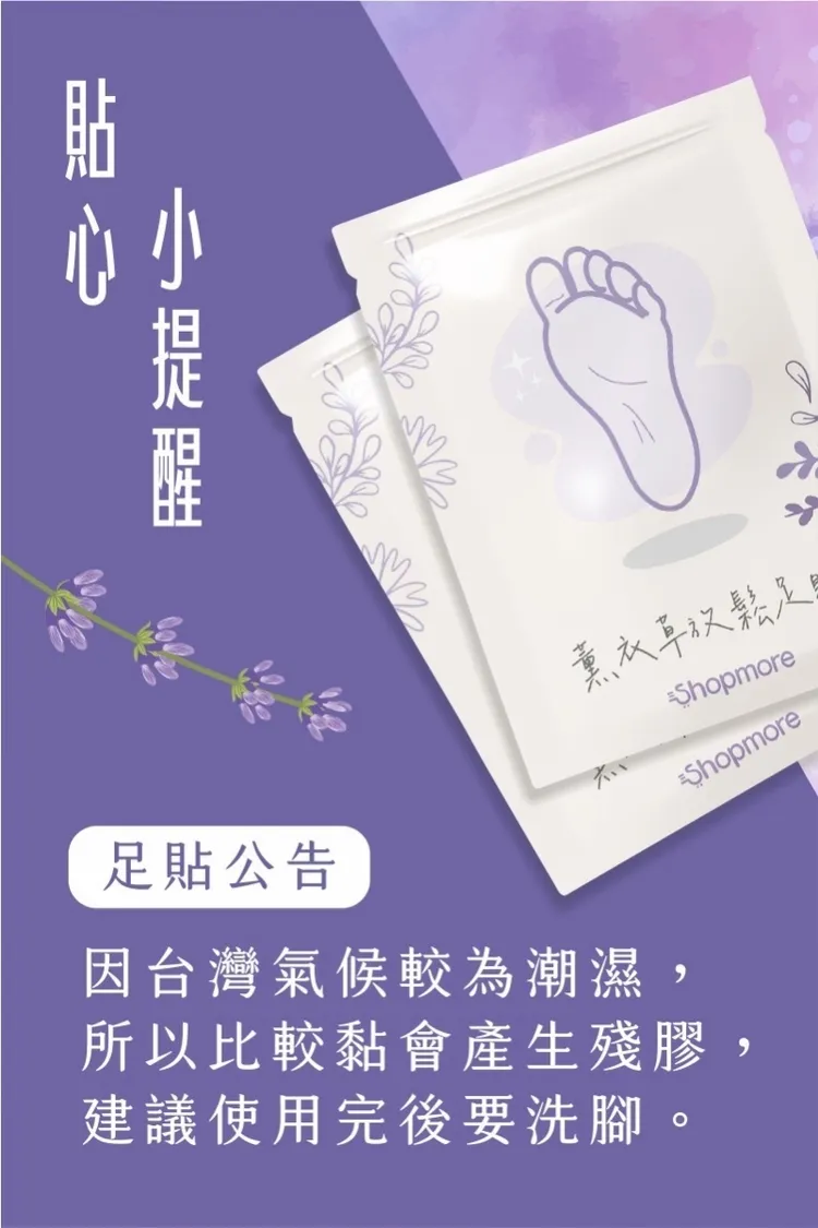 「Shopmore薰衣草放鬆足貼」 一覺醒來足有感! 草本配方 濕氣掰掰 促進代謝 加速循環 促進足底代謝、甩水放鬆紓壓 主成分:孟宗竹、艾草、薰衣草精油、生薑、紅豆、薏仁 使用方法:先清潔足底,撕開貼布貼紙,將粉包有圖案面貼至貼布中央,將貼布貼於足底,約7-8小時後撕除,並用清水清潔足部。 內容物:1雙足貼(貼布2片、粉包2片)、乾躁劑1包 保存方法:放置陰涼乾燥處及幼童無法取得處,並避免陽光直射。