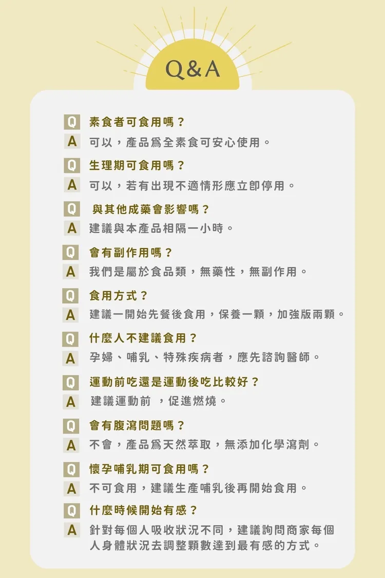 代謝:瓜拿納萃取物,香檸檬纖維朝鮮薊葉萃取複合物(香檸檬纖維,朝鮮薊葉萃取物),石決明子萃取物,脂解酵素,澱粉分解酵素,日本專裡水解小麥胚芽,乳糖分解酵素,專利茶花萃取物,馬鈴薯萃取物,蘋果果膠,綠薑素萃取物,綜合蔬果發酵物(糊精、昆布、裙帶菜、紫菜、香菇、檸檬馬鞭草、苦艾、西番蓮、金盞草、大飛揚草、牛筋草、檸檬草、大茴香、馬黛茶、魚腥草、紫蘇、薰衣草、貓薄荷、洋甘菊、生薑、益母草、芭樂葉、丁香、咸豐草、迷迭香、燕麥片、玉米、大麥、豌豆、紅豆、薏仁、芝麻、刺槐豆、小米、大豆、爆裂玉米、黑麥、黑豆、鷹嘴豆、扁豆、糙米、鳳梨、香蕉、蘋果、木瓜、芭樂、哈密瓜、酪梨、梅子、西印度櫻桃、檸檬、葡萄乾、芒果、楊桃、西瓜、腰果、核桃、奇異果、西洋梨、巴西莓、卡姆果、萊姆、玫瑰果、橘子、樹莓、柳橙、水蜜桃、蘿蔔、高麗菜、蓮藕、牛蒡、菊苣、甘藷、南瓜、木薯、番茄、羽衣甘藍、青椒、紅甜菜、胡蘿蔔、長型南瓜)