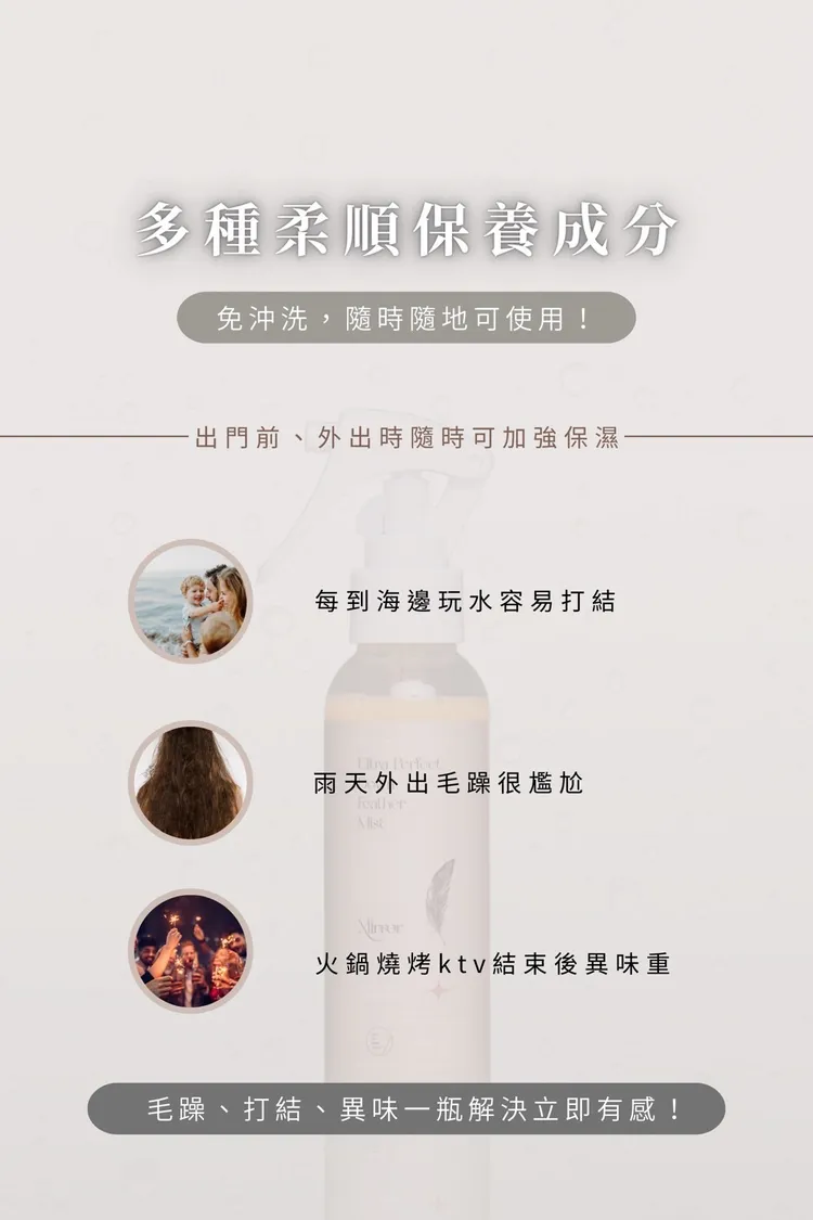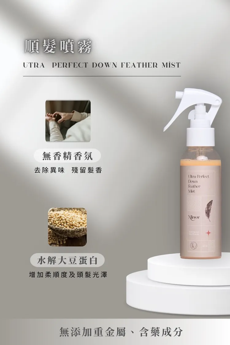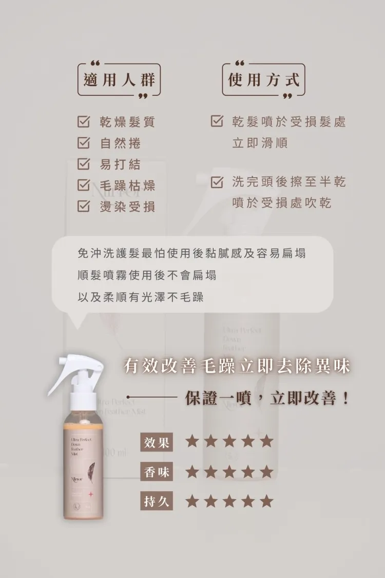 「超完美羽絨噴霧」100ml 內含豐富角蛋白成分,角蛋白是頭髮中的一種基本蛋白質,添加蛋白質到秀髮中, 可幫助恢復強韌度並修復基礎損傷、保持頭髮強壯、柔軟和健康。適合噴灑於吹乾後增加光澤感,梳順後降低毛躁、加強手感上的柔順。