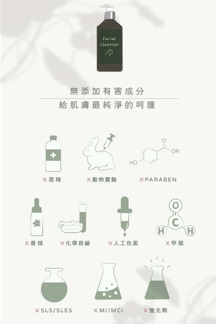 本產品無添加:酒精.動物實驗.人工色素.香精.化學皂鹼.PARABEN.SLS/SLES.MI/MCI.甲醛.螢光劑